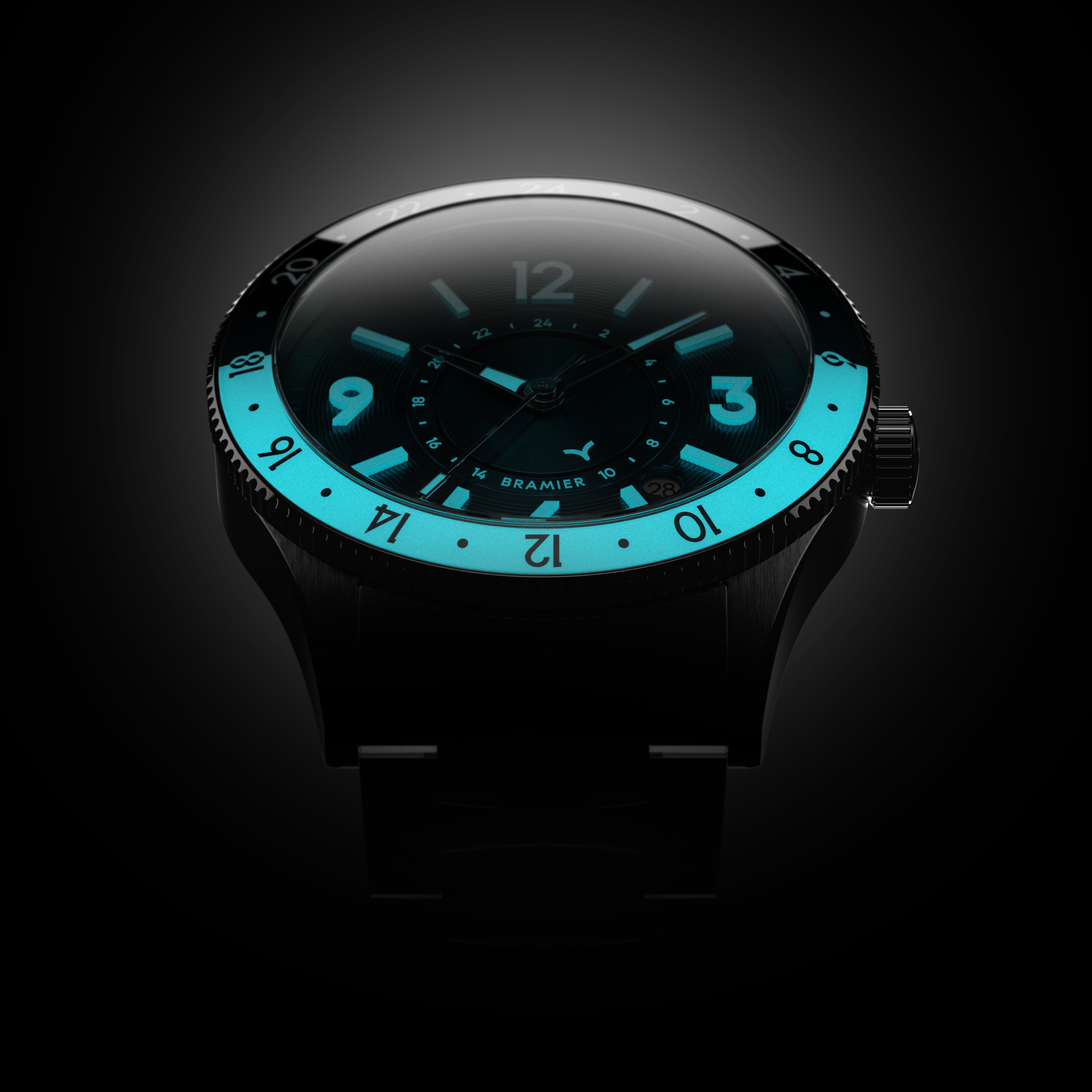 We understand the importance of lume in a watch, especially when used on your global explorations. The Rocks Trilayer indexes are 3D-molded with Swiss Super-LumiNova® BGW9. Luminous pigment is also found on the inner bezel, hands, and bezel. This effective combination allows for optimal reading of time in all conditions.